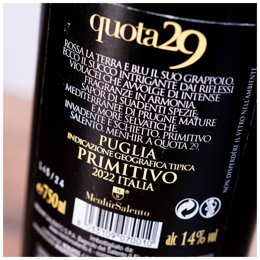 Za vínem stojí vinařství Menhir Salento z Puglie. Zaměřují se na místní (autochtonní) odrůdy jako Primitivo a Negroamaro. Pracují s moderní technologií, ale drží tradici regionu. Víno Quota 29 vyrábějí s důrazem na poměr kvalita-cena - aby bylo dostupné, ale poctivě udělané. A to se jim daří už přes 20 let.